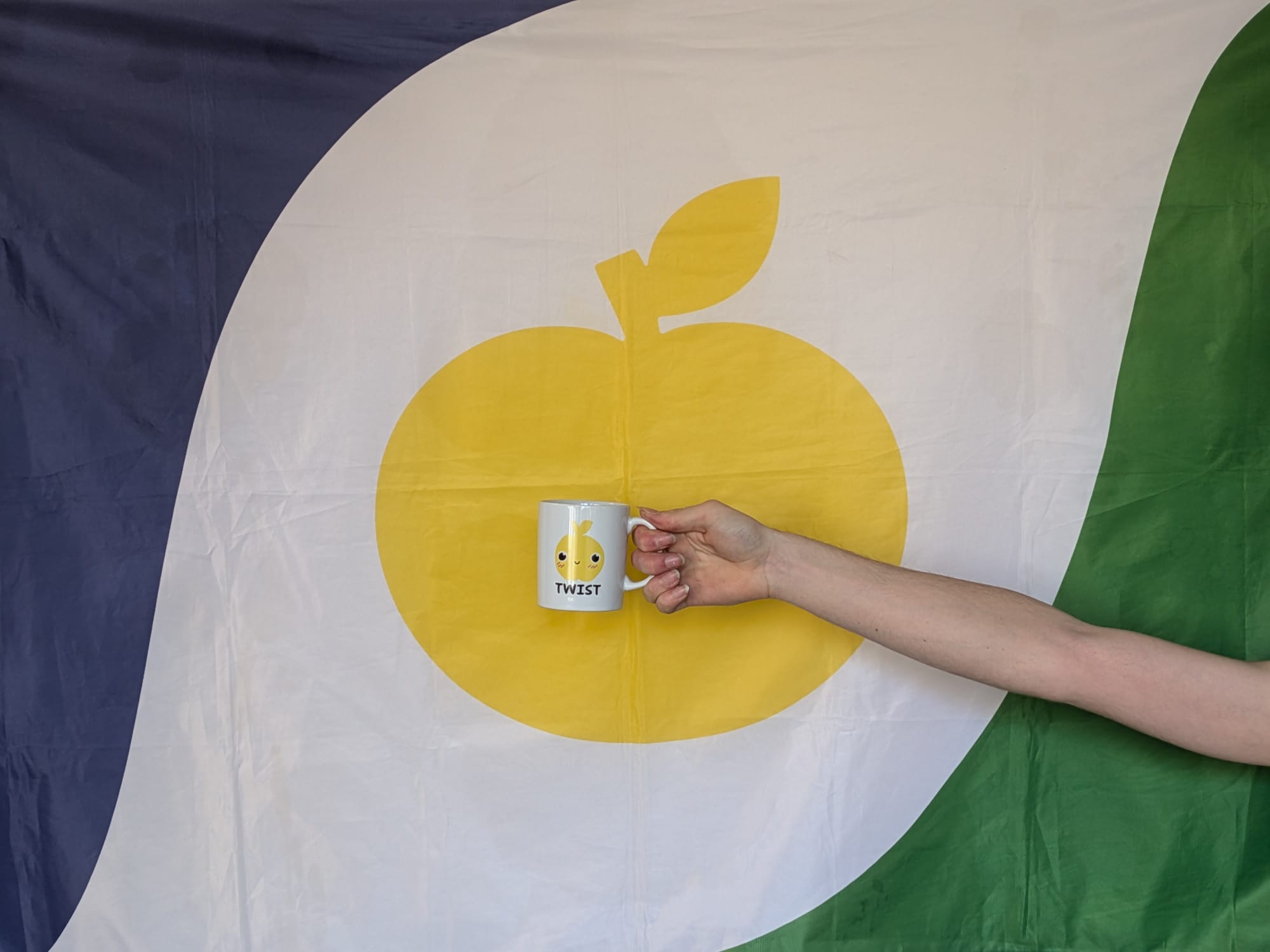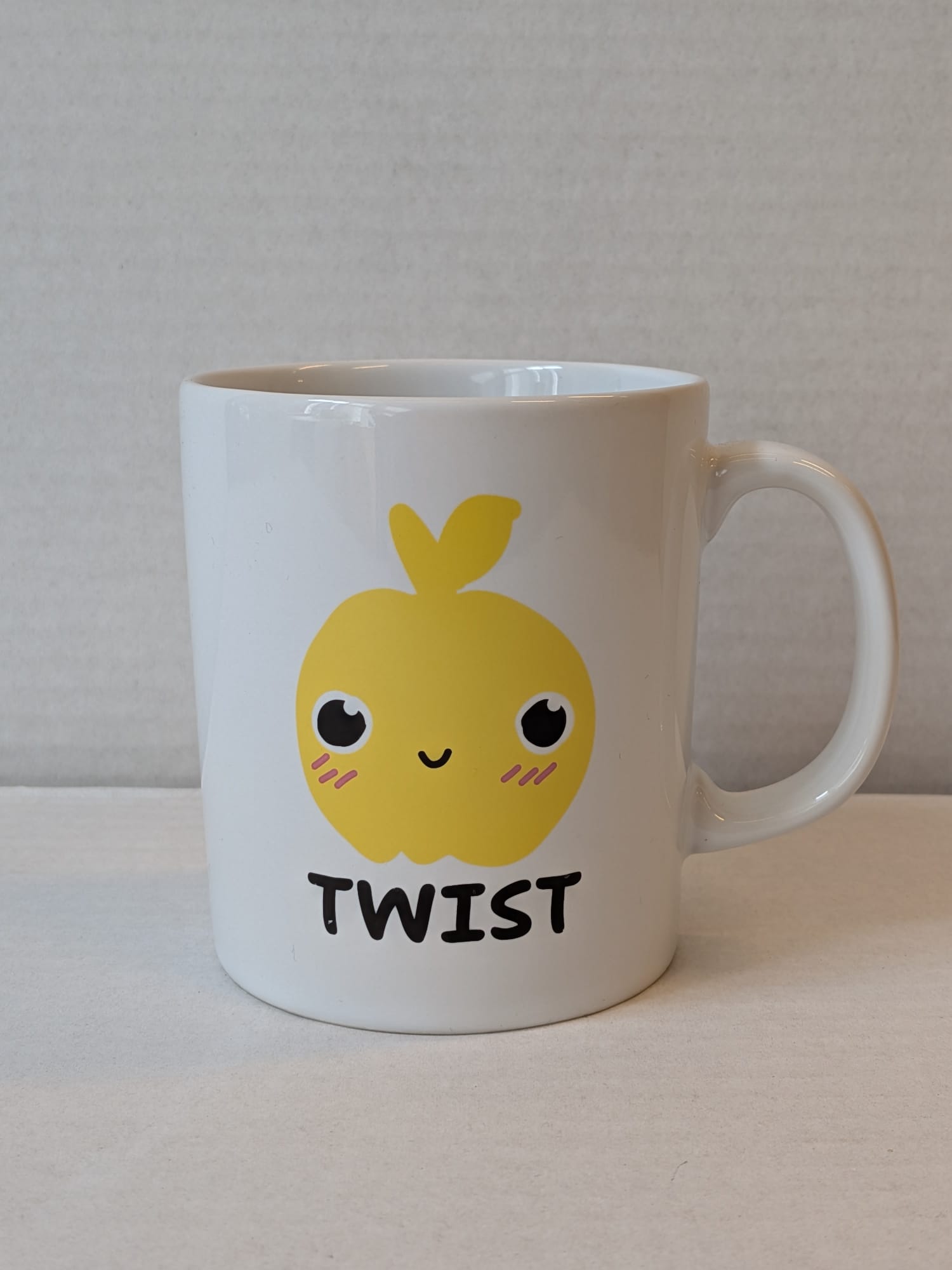 A mug with a cute version of the TWapple on it.